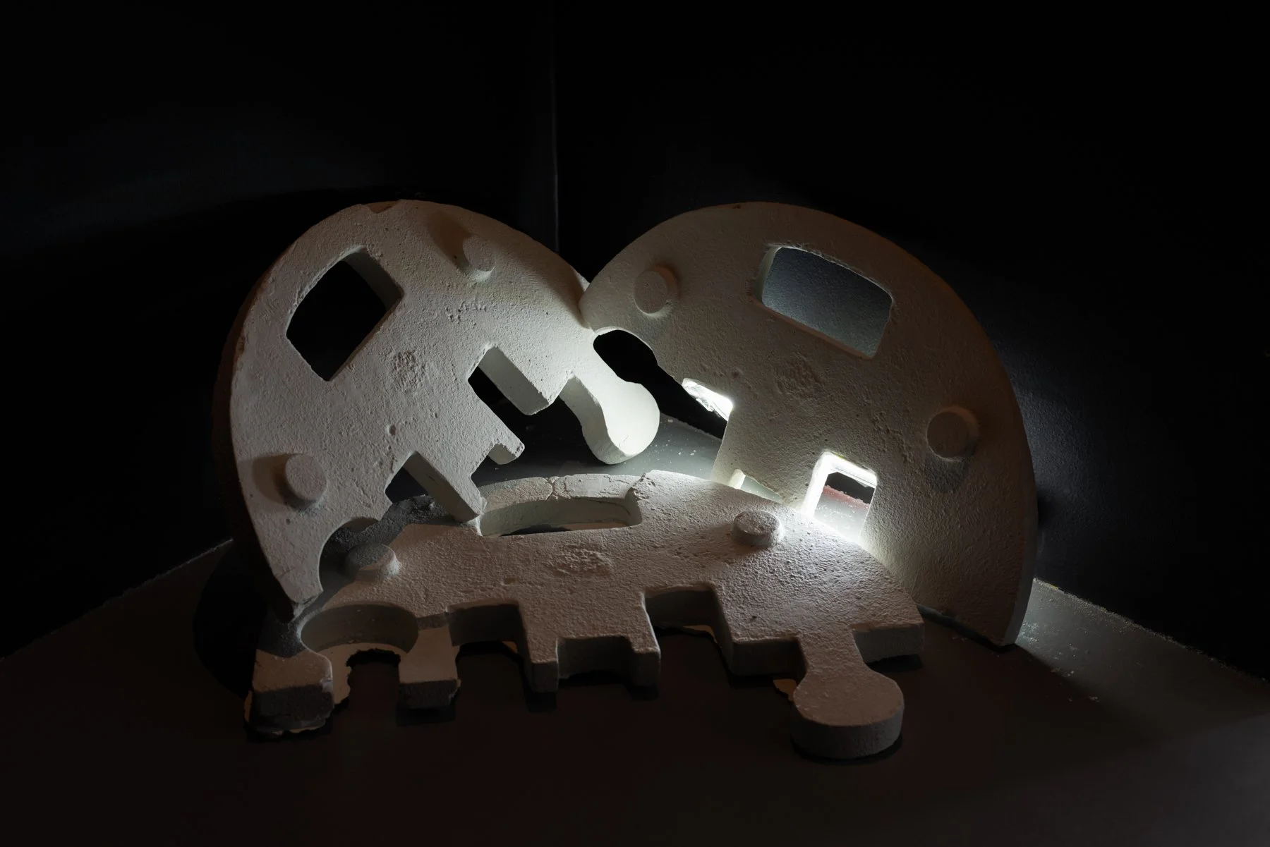 Time unfurls and folds as you step within the confines of the black box at BABEL visingsrom for kunst, an installation comprised of two thousand, two hundred and forty white plaster casts of the artists’ breasts. These breasts were modeled by the artist during her foundation year before entering the art academy, embodying her younger self and serving as the muse and guide for this exhibition. Rudjord, in her artistic exploration, communes with herself to delve into a range of themes revolving around women and the enduring archetypes that persist in our contemporary world. The commanding presence of Rudjord's breasts exerts a powerful control over the space, creating a trompe-l'œil effect that confronts any attempt to objectify her sexuality with sheer force. This space acts as a bridge across time, allowing Rudjord to venture with her muse into an exploration of the realities experienced by women.