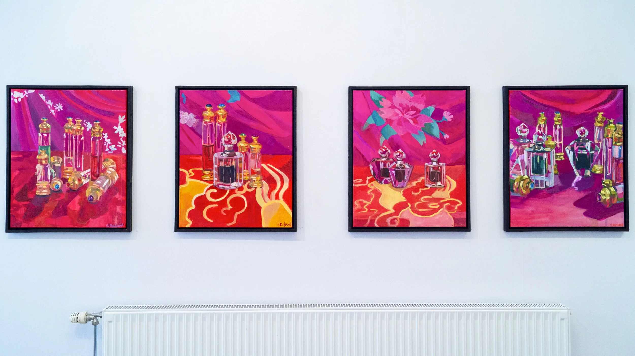 In the exhibition Flacons and Faces, Vilde Rudjord has worked with still lifes as a reflection of herself and where she comes from. In the exhibition we see toys from her childhood, her mother's perfumes, decorative objects and ceramics from her grandmother, all draped in textiles from her childhood home. We also see the sale of breast casts and frogs, elements she has used in previous works and which point to Rudjord's pictorial universe.